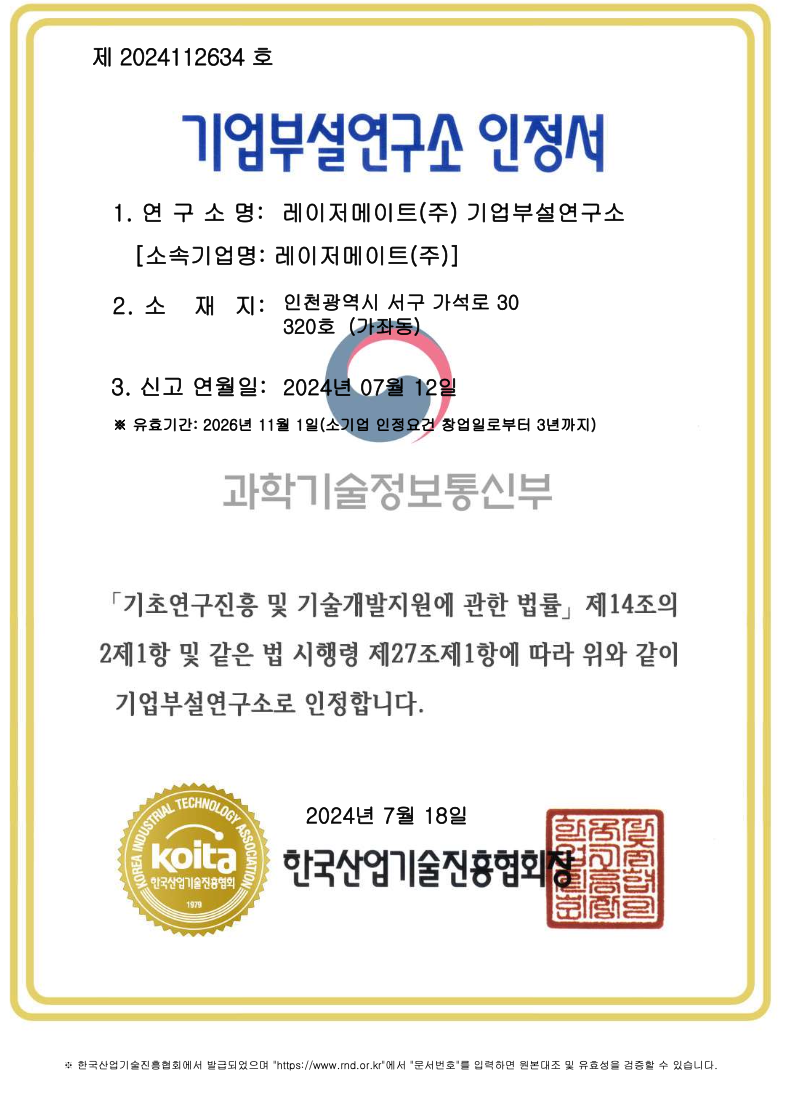레이저메이트(주)의 특허 및 인증서 현황을 안내합니다.